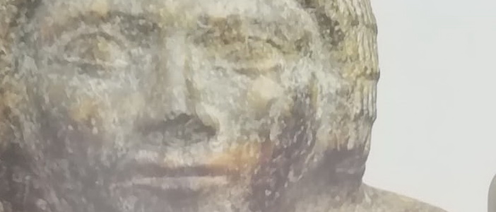L’uomo porta una parrucca corta e riccia, resa con incisioni orizzontali intersecate da segmenti verticali, che gli incornicia il volto dai lineamenti marcati: grandi occhi, naso diritto, zigomi alti, guance piene, bocca dalle labbra sporgenti.