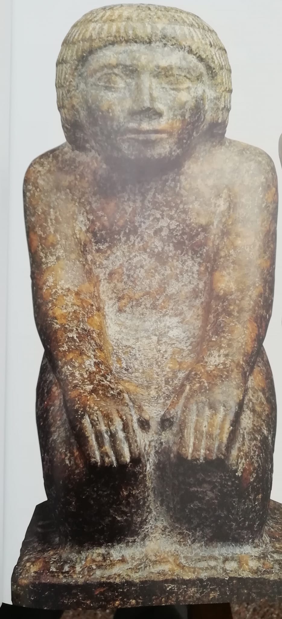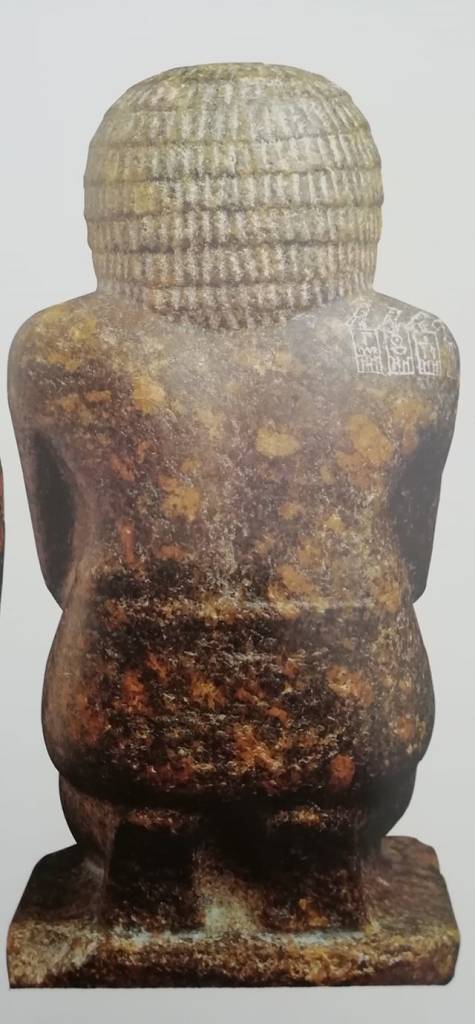 Sulla base è iscritto in bassorilievo il nome dell’uomo “Hotepdjef”, probabilmente un sacerdote dedito al culto dei primi tre sovrani della II Dinastia, i cui nomi sono incisi sulla spalla destra: Hotepsekhemuy, Raneb e Nynetjer.