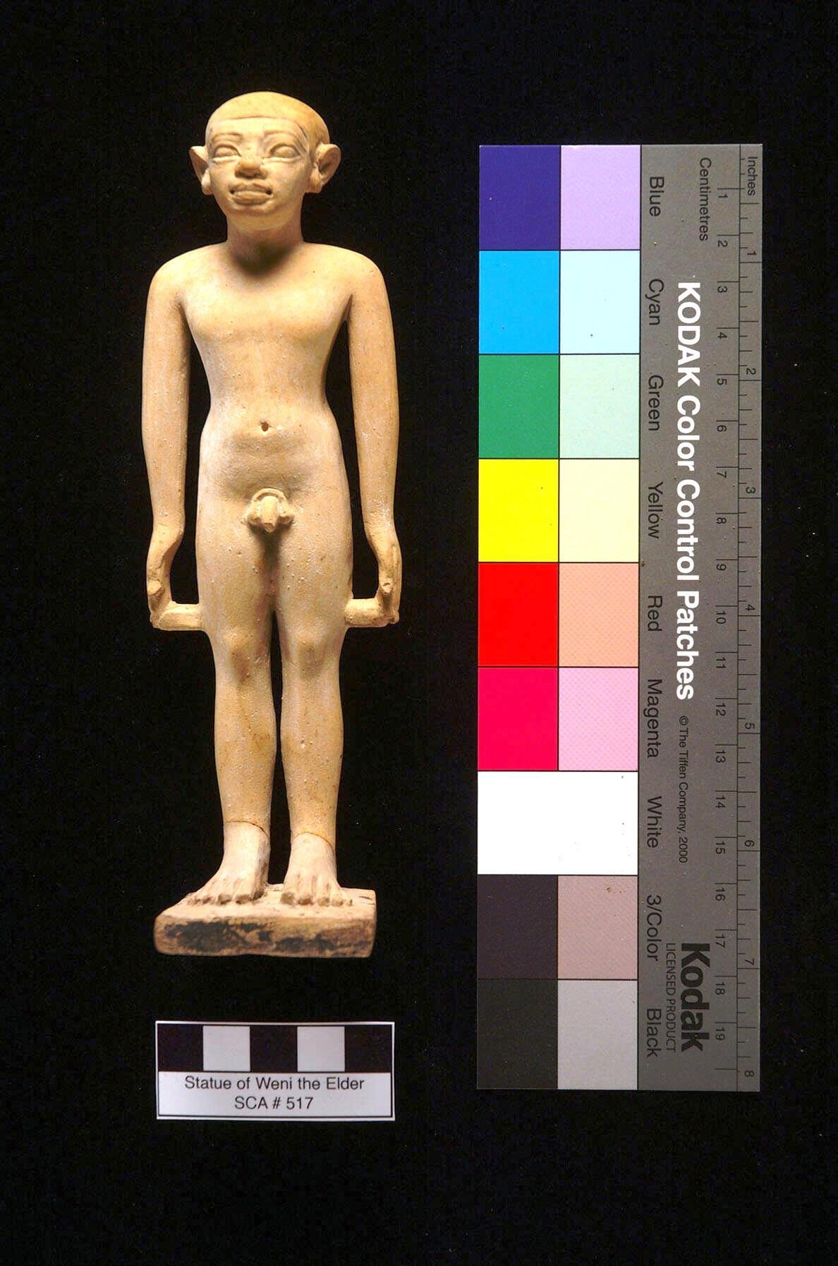 Il collegamento finale a Weni proveniva da una struttura rettangolare nell’angolo sud-est. Questa conteneva i resti deteriorati di più di trenta basi in legno per statue, oltre a diversi elementi disincarnati come braccia, mani, frammenti di animali e componenti in pietra calcarea di scene di produzione, come bacini in miniatura ricoperti da colini a cestello per la produzione di birra. Il manufatto meglio conservato e più significativo era una statuetta in calcare, splendidamente eseguita, del proprietario della tomba da ragazzo, identificato come il “conte” Weni”>>.