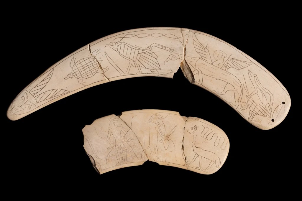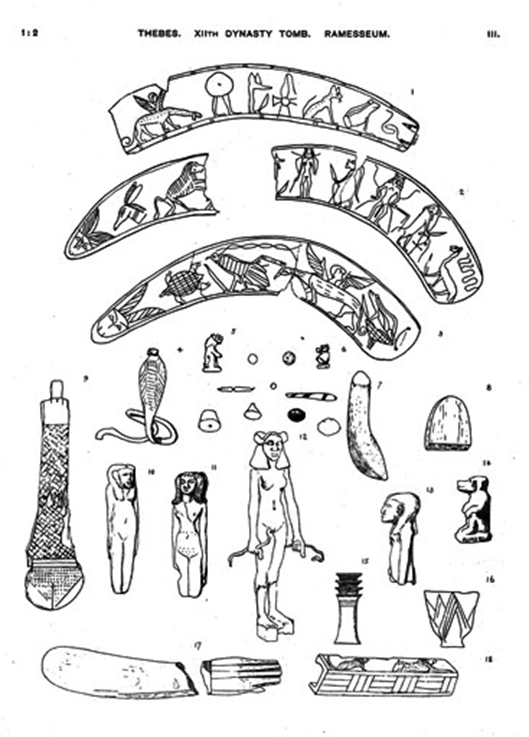Il bizzarro contenuto della “scatola del mago” rinvenuta nella “Tomba del Ramesseum” o “Tomba 5”, risalente al medio Regno, nel disegno di James Quibell con diverse bacchette apotropaiche in zanna di ippopotamo, con decorazioni incise che intendevano pervadere la bacchetta con il potere della “heka”