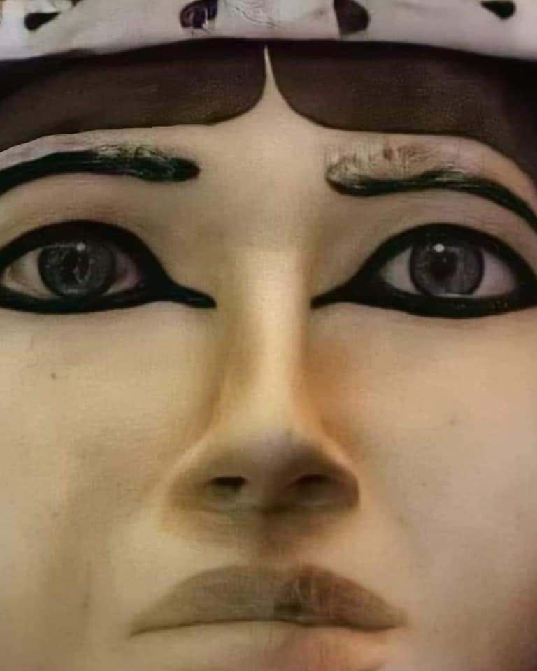 Il volto presenta lineamenti delicati : gli occhi, incastonati, sono contornato dal trucco nero, il naso piccolo e la bocca carnosa.