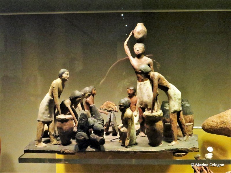 Modellini come questo erano realizzati e collocati nelle tombe affinché i servitori negli stessi raffigurati continuassero a servire il defunto nell’aldilà. Questo in particolare rappresenta, condensate in un unico momento, tutte le fasi della produzione del pane e della birra, elementi alla base della dieta degli antichi egizi e delle offerte che gli stessi facevano ai defunti. I nove servitori hanno i capelli neri o una parrucca a caschetto e indossano un corto gonnellino bianco.