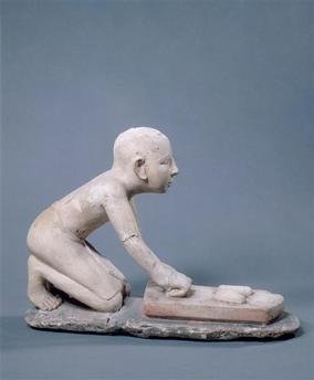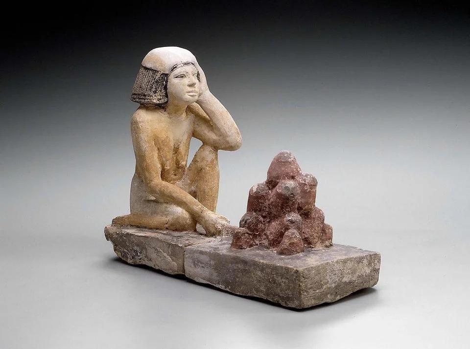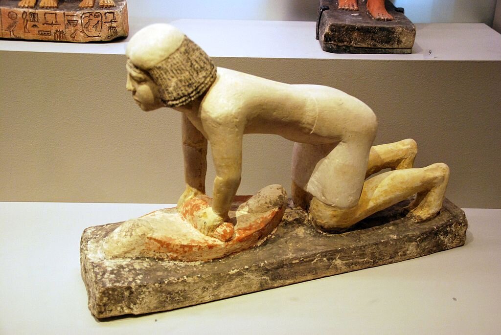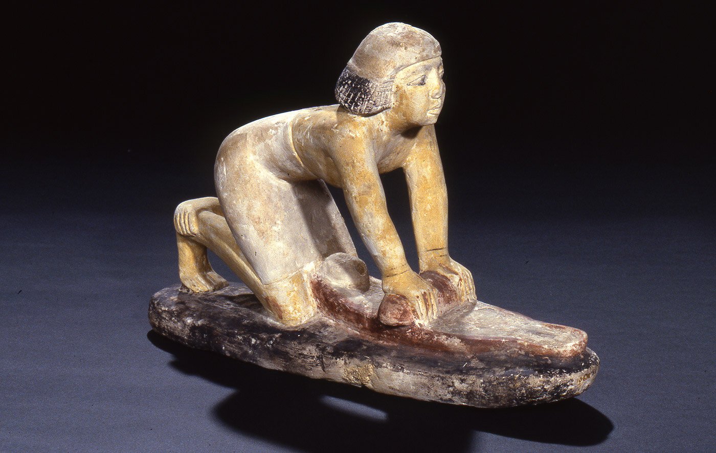 Donna che macina il grano – da Giza, dal serdab della tomba G 2415 – V dinastia, regno di Niuserre – oggi al MFA di Boston – La donna indossa un panno sopra i capelli per proteggerli dalla farina.