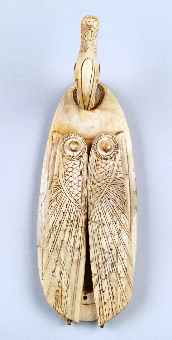 Le ali di questo affascinante contenitore per cosmetici, realizzato in avorio di ippopotamo/elefante ed osso, si aprono verso l’esterno, rivelando il vano in cui inserire il prodotto.