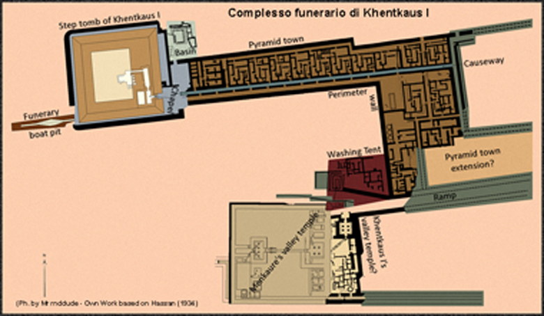 Il suo complesso funerario comprende la piramide, un tempio della valle, una città piramidale, un serbatoio d’acqua e granai, il tutto è stato catalogato da Lepsius come LG100. Sul lato sud-ovest della piramide, è stata rinvenuta una fossa di circa 30 metri di lunghezza e 4 di profondità, tagliata interamente nella roccia, trova posto la sua barca solare, il riferimento potrebbe essere alla barca notturna, detta “Mesketet”, del dio sole Ra. A questo punto si può ipotizzare l’esistenza anche di un’altra fossa con la barca diurna, detta “Mandet”. L’insieme delle due barche veniva chiamato “Maaty” ed era riferito alla Maat, il principio dell’ordine cosmico. Al momento non mi risulta che sia mai stata cercata. La sovrastruttura della piramide è costituita da due gradoni con una pianta quadrata orientata nord-sud, le pareti sono arricchite da nicchie, ad imitazione di false porte. Alla piramide si accedeva attraverso una maestosa porta in granito rosa, che riportava la titolatura ed il nome di Khentkaus I, da qui un passaggio scende dal pavimento della cappella interna e conduce alla camera funeraria.