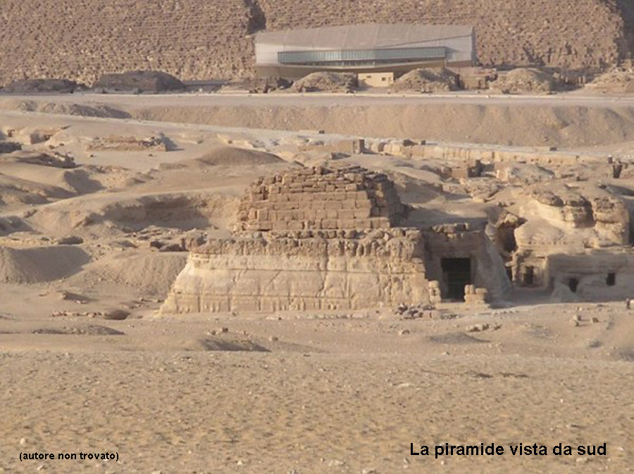 Dalla piramide di Chefren scendiamo verso oriente spostandoci dai resti della rampa processionale verso sud, poco prima del tempio della valle di Chefren notiamo una costruzione a due gradoni costruita per la regina madre Khentkaus I (o Khentkawes).
