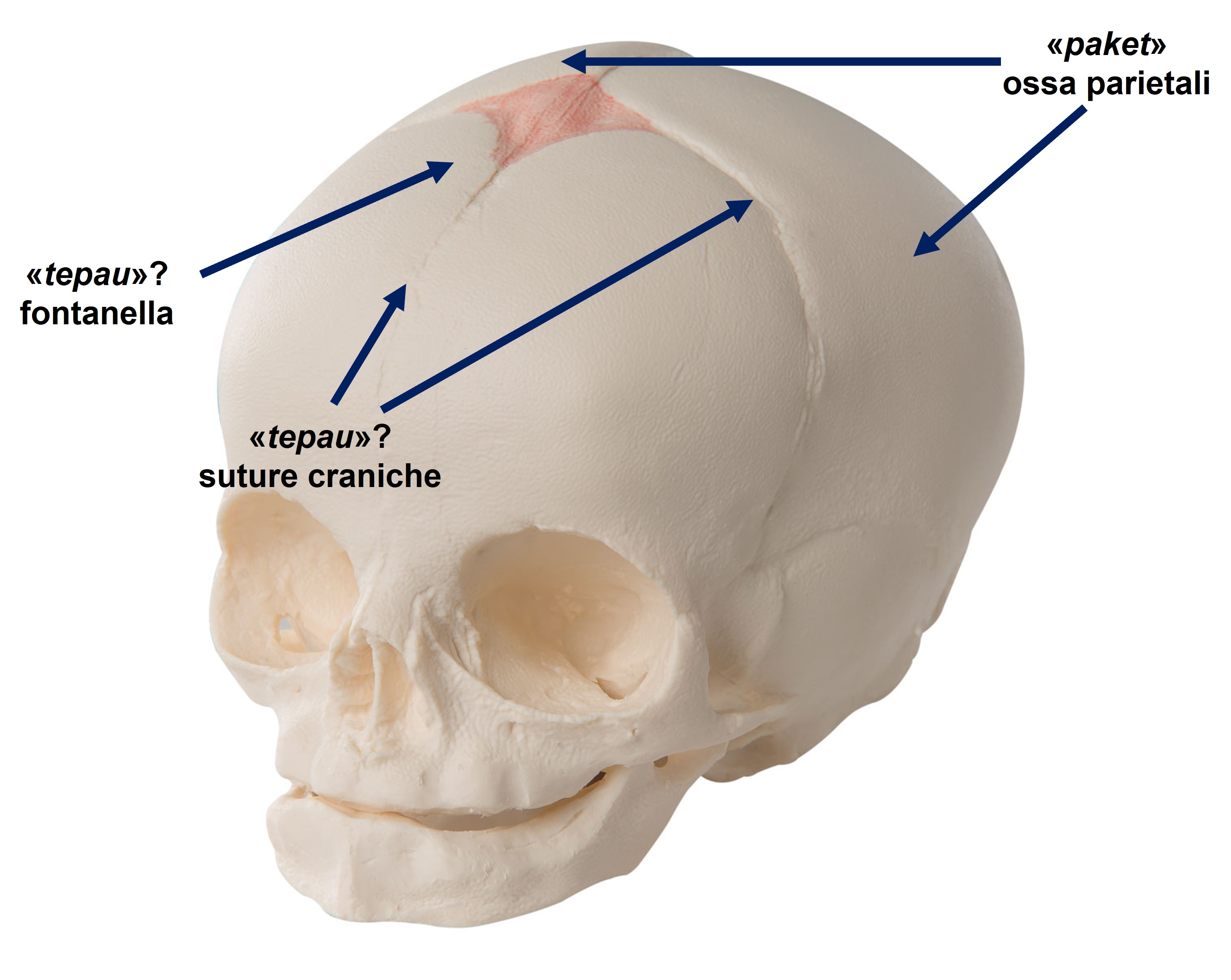 “Tepau” è “ciò che c’è tra le due tartarughe, ed è di pelle”: con ogni probabilità è la “fontanella”, ma è stato ipotizzato che sia la “grande falce” o “falce cerebrale” (la membrana fibrosa derivata dalla dura madre che divide i due emisferi cerebrali) esposta in caso di frattura, o che si riferisca alle suture tra le ossa del cranio.
