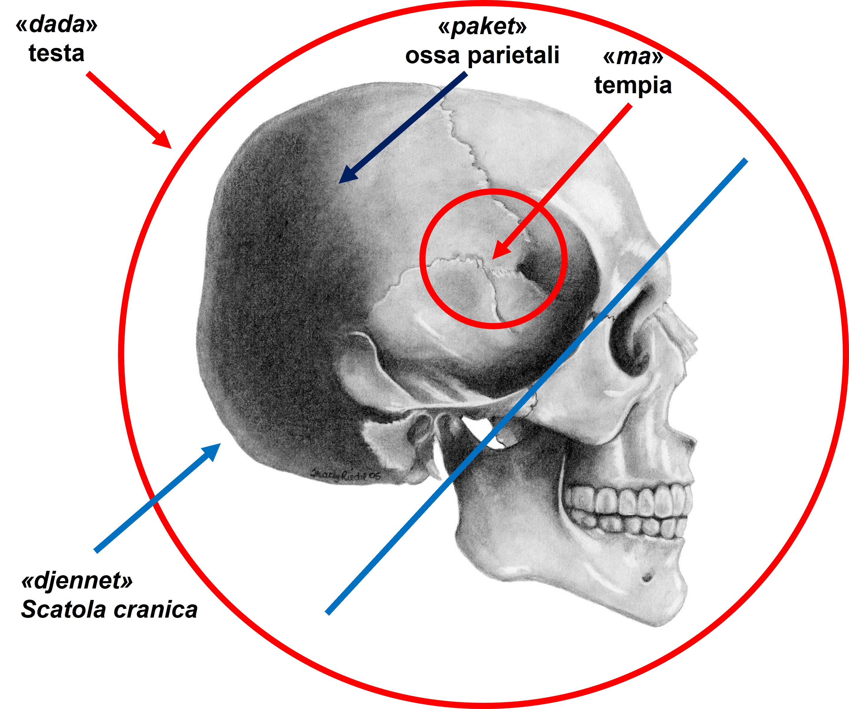 “Djennet” è la scatola cranica in sé (più specificatamente l’insieme delle ossa craniali – frontale, etmoide sfenoide, occipitale, parietali e temporali, escluse le ossa facciali) e ci si riferisce ad esso soprattutto per le fratture – ma a volte non da prendere in senso letterale: pare che “una rottura del cranio, che schiaccia il cervello e rende dolorosi i sette fori della testa” sia una forma un po’ melodrammatica per indicare l’influenza. “Ajs n djennet”, le “visceri del cranio” è il termine per indicare il cervello