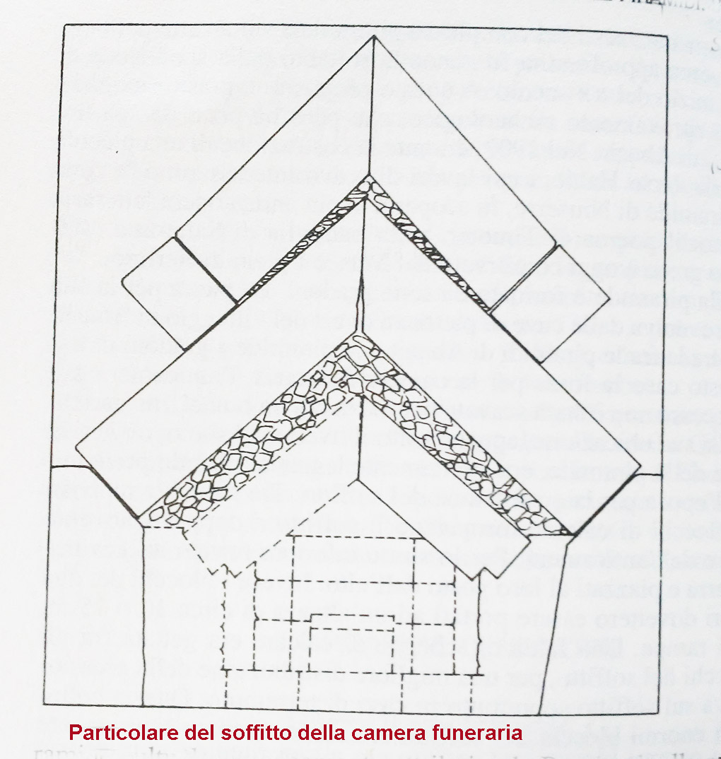Il soffitto delle due camere era formato secondo il metodo predominante a quell’epoca, tre strati sovrapposti di massicci blocchi di calcare sistemati a capriata. Particolare interessante è che questa volta venne usata una tecnica diversa, tra uno strato e l’altro era stata stesa una falda, più o meno regolare, di schegge e pietrisco, probabilmente per distribuire meglio la pressione o, forse, per servire da ammortizzatore in caso di terremoti, quest’ultima ipotesi è tutta da provare e non si sa se l’intenzione fosse proprio quella. L’anticamera e la camera funeraria erano situate appena sotto il livello della base in corrispondenza dell’asse verticale della piramide. Lo stato di devastazione lasciato dai saccheggiatori era tale per cui non è stato possibile ipotizzare una ricostruzione dell’architettura.