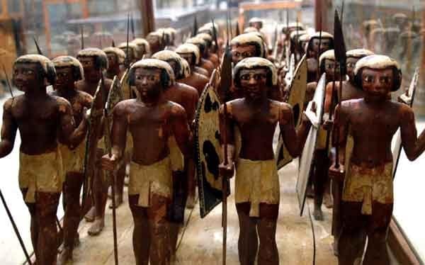 Modellino ligneo dalla tomba di Mesheti ad Assiut, Il Cairo, Museo egizio. Le differenze nell’abbigliamento, nella statura e nella sfumatura del colore della pelle dei soldati manifestano l’interesse dell’artista verso la riproduzione quanto più fedele possibile della realtà.