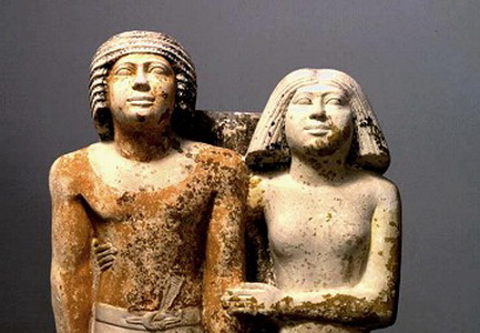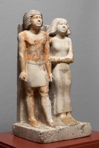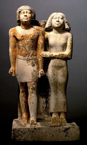La moglie, la cui figura è proporzionata a quella del marito, gli cinge la schiena e gli tocca il braccio.