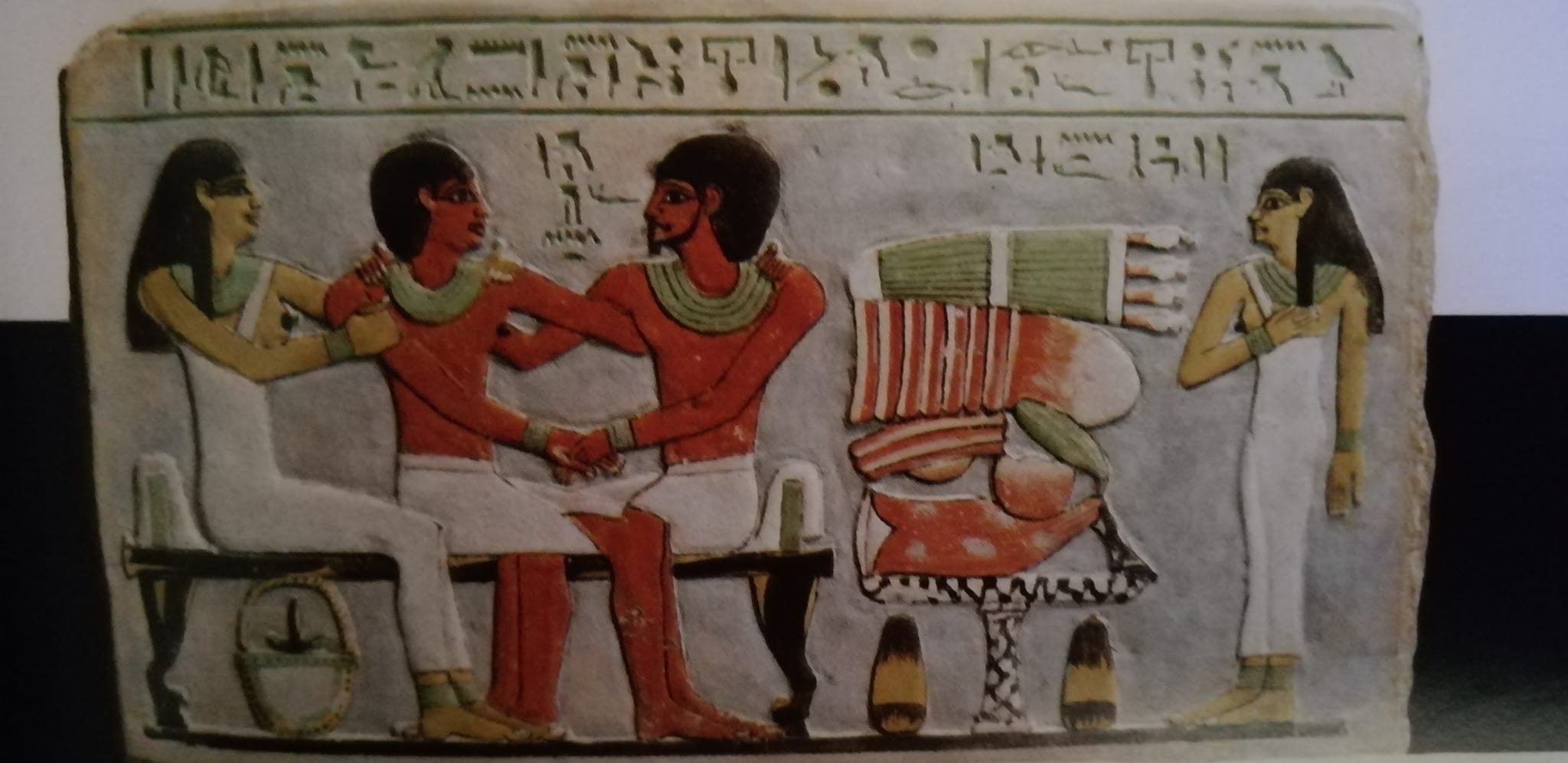 Una tavola d’offerta, colma di carni e verdure, separa il gruppo familiare da una figura in piedi, identificata dall’iscrizione geroglifica sovrastante, come Ipy, la nuora del defunto.