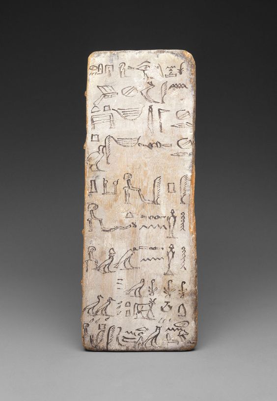 Tavoletta da scrittura risalente all’XI dinastia; fu rinvenuta a Meidum ed ora si trova al Cairo. essa è chiaramente stata usata da un apprendista scriba per i suoi esercizi scolastici; il tratto incerto del geroglifico è evidente. Esse potevano essere usate più volte, cancellando la scritta precedente con una mano di bianco.