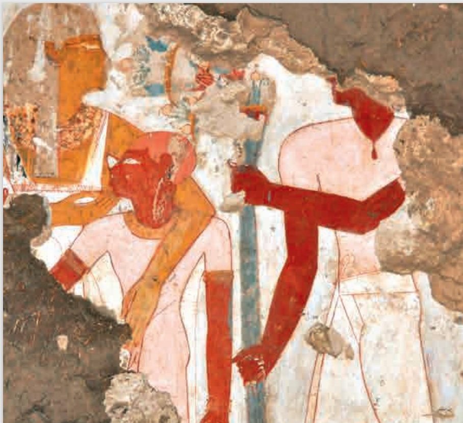 Dettaglio della tomba di Kenamun, fratello di latte di Amenhotep II, che mostra il sovrano sulle ginocchia di Amenemope, madre di Kenamun, che fu una delle sue nutrici. Dall’opera di Norman de Garis Davies, The Tomb of Ken-Amun at Thebes, New York – 1930, tav. 9.