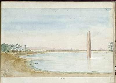 Veduta del Nilo e dell’Obelisco di Sesostri I a Heliopolis, Egitto. Acquerello di Pascal Coste (1787-1879). Biblioteca comunale di Marsiglia