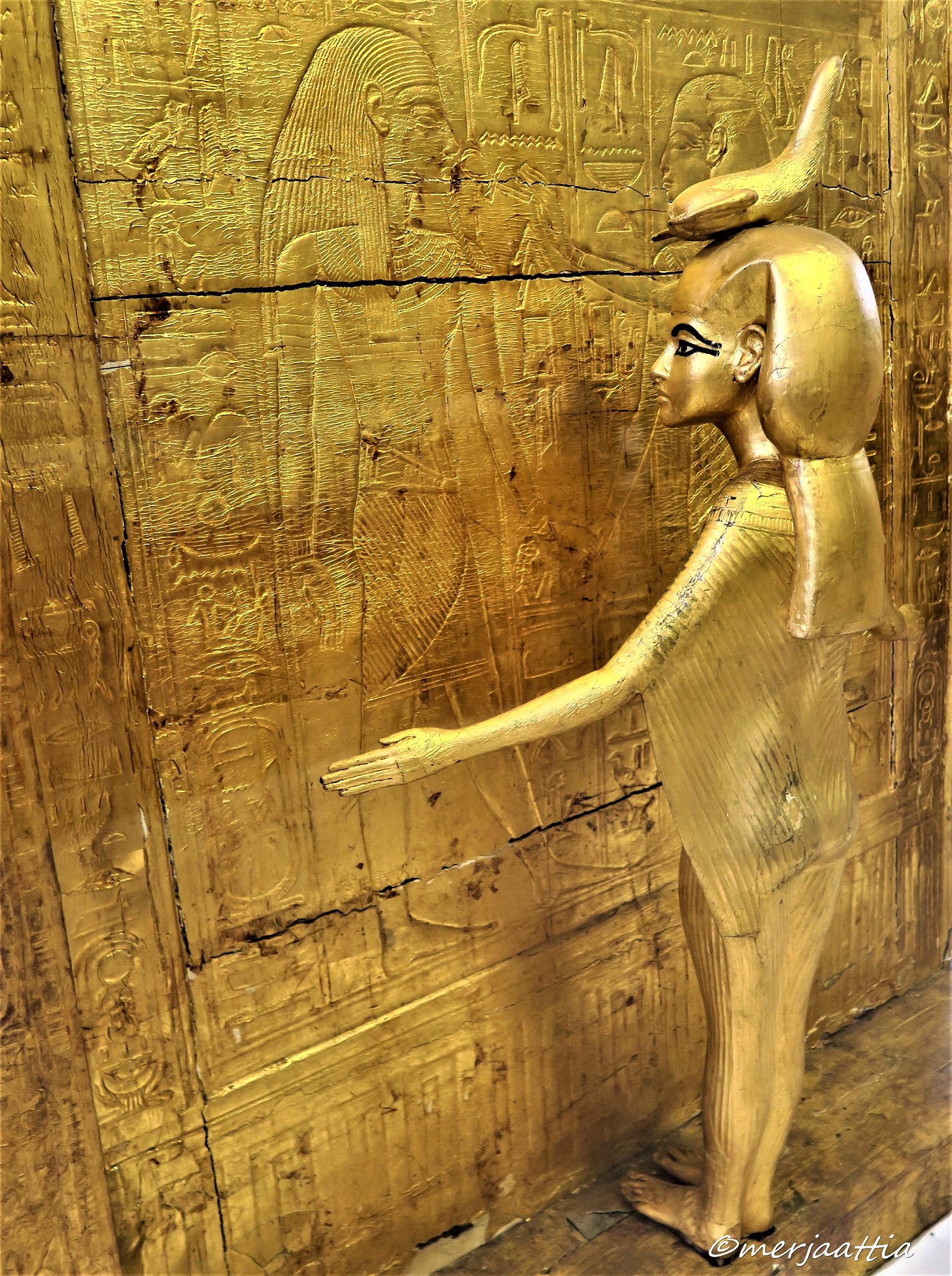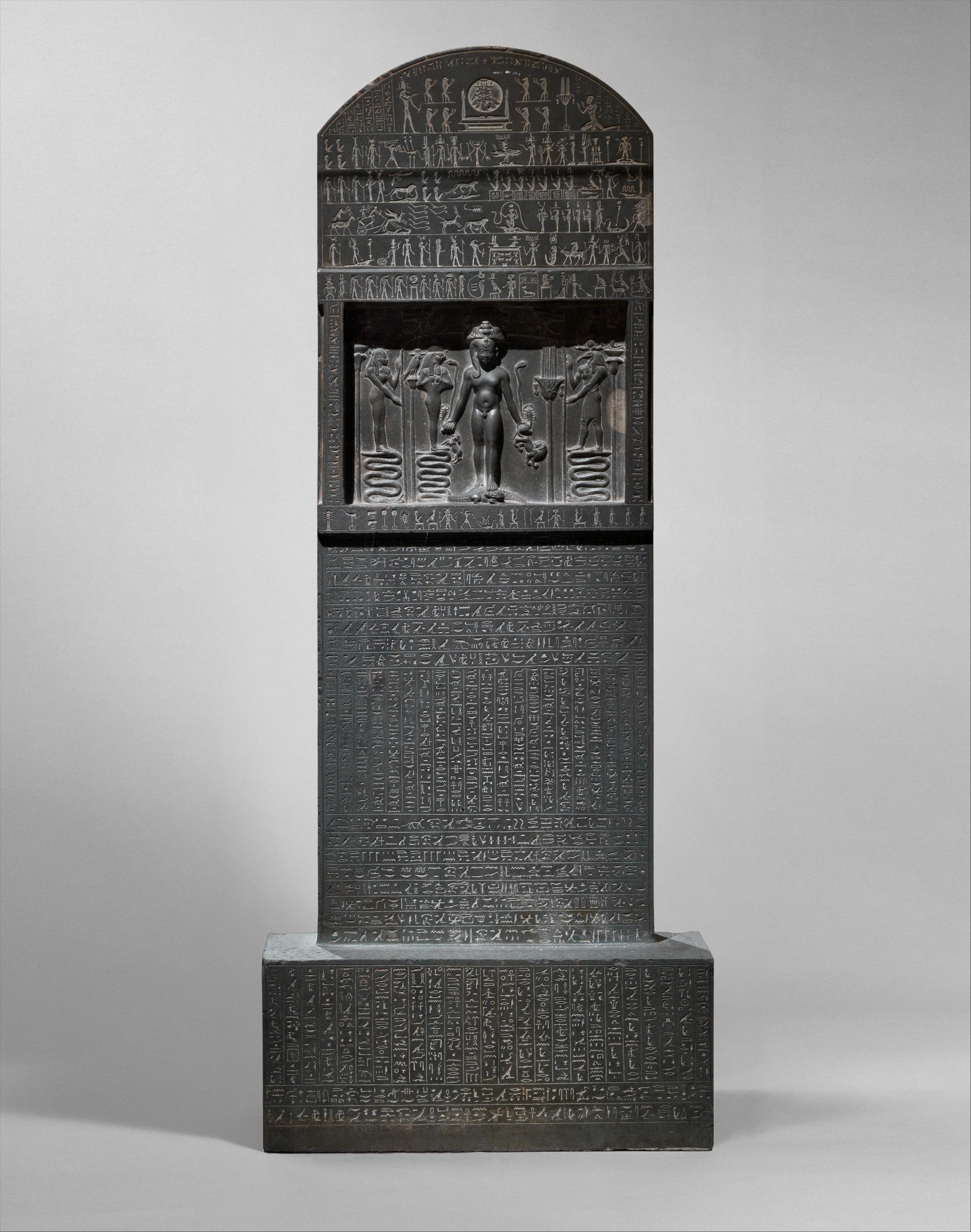 “O Ra, vieni da tua figlia (Bastet), punta da uno scorpione su una strada solitaria: le sue grida di dolore arrivano al cielo; ascoltala sul tuo cammino” (la stessa formula è iscritta sulla statua di Djedhor del Periodo Tolemaico al Museo Egizio del Cairo, JE 46341)