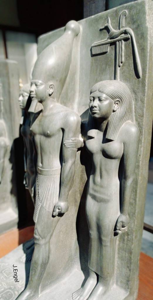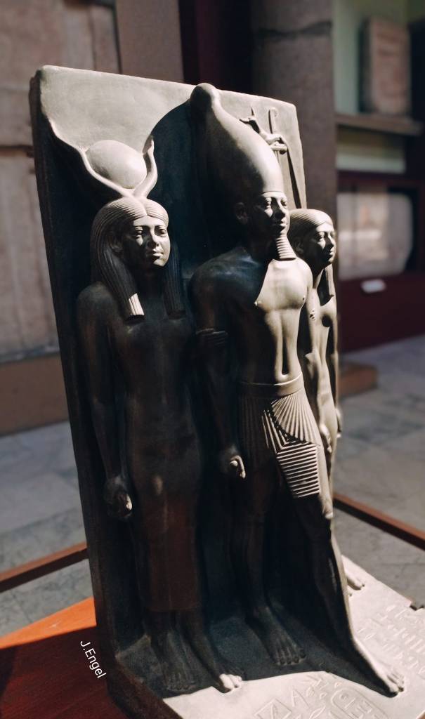 The goddess Hathor, on his right, is crowned with the sun disc between the two cow’s horns.