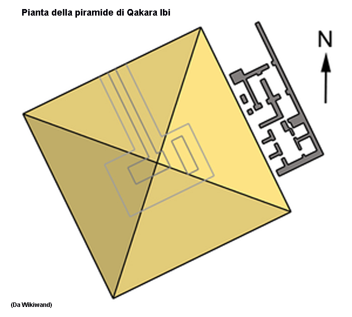 La piramide pare avere il maggior grado di inclinazione di tutte le altre, 61°. Data le sue piccole dimensioni e la particolare struttura interna, si pensa che in origine fosse una piramide di qualche regina che poi venne usurpata da Ibi. Sulle pareti della camera funeraria sono incisi i “Testi delle piramidi”. Di Ibi è stato pure rinvenuto un graffito sulle rocce a Tumas in Nubia.