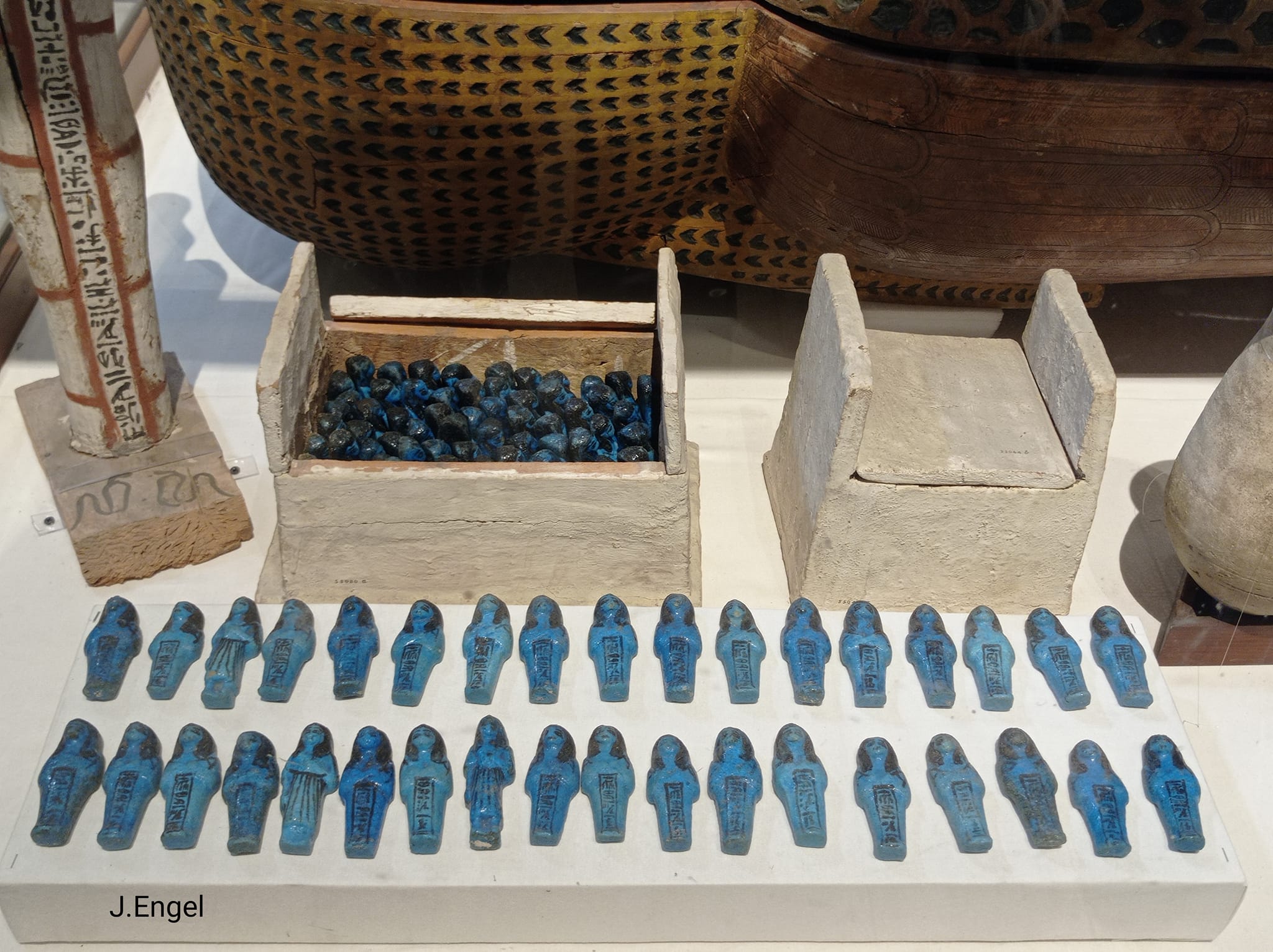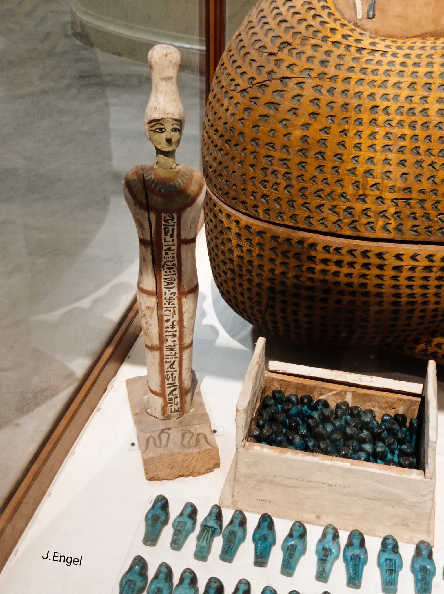 In the 21st Dynasty (about 1050 BC), priests restored her coffins and mummy, leaving an offering of flowers at the foot of the coffin when they finished their work. At about the same time, another woman was buried elsewhere in the tomb. Ahmose-Merytaman originally had three coffins. The outermost one was broken up by robbers. The middle is on display here, while the inner coffin, which is about 60% the size, is now in the National Museum of Egyptian Civilization.
