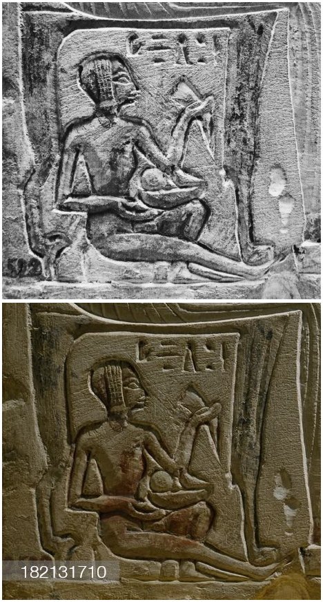 Il dettaglio proviene dalla stele funeraria di Ramose, funzionario della Diciannovesima Dinastia che servì in qualità di scriba e amministratore sotto Ramses II. Ramose era un funzionario del tempio, appartenente ad una famiglia che deteneva alti incarichi fin dal regno di Tuthmosi IV (Diciottesima Dinastia). Fu scriba del tesoro del tempio in qualità di contabile per gli Armenti di Amon e amministratore capo per la Casa del Portatore del Sigillo.