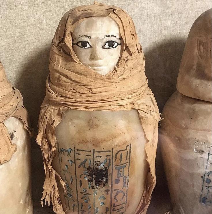 I quattro vasi canopi di calcite sono stati trovati avvolti in teli di lino, con solo il volto esposto; recano iscrizioni intarsiate di pasta vitrea blu e hanno il coperchio a forma di testa umana probabilmente non originale perché non si adatta alla bocca del vaso.