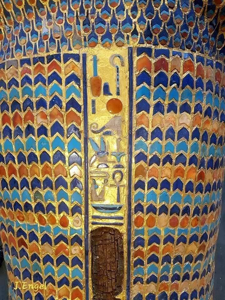 The missing cartouche inlay down the center of the lid was likely a jewel made of carnelian or glass to match the color scheme of the coffin. This inlay was not violently hacked at and likely was not destroyed during its removal. Instead, it appears to have been popped out with a sharp instrument which may have left its mark in the wood on the upper right side of the slot creating no damage to the delicate surrounding inlays.