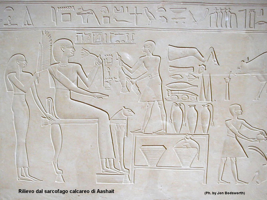 Aashait, dalla cui carnagione marrone si deduce che fosse nubiana, il cui rango era palesato sul suo sarcofago dorato, vantava tra gli altri il titolo di “Amata Sposa del Re”, lei e altre tre delle sei donne furono regine e la maggior parte di loro, secondo Arnold, sarebbero tutte appartenenti alla categoria delle “Sacerdotesse di Hathor”, dea protettrice della necropoli tebana. Callender invece pensa abbiano fatto parte dell’Harem di Mentuhotep II in qualità di garanti delle alleanze che il sovrano si sforzava di mantenere per rendere stabile la situazione politica e mantenere unito il paese. Il sarcofago in calcare di Aashait è un manufatto di notevole pregio.