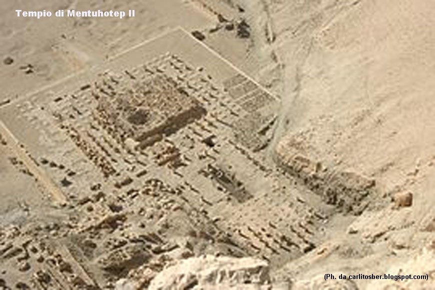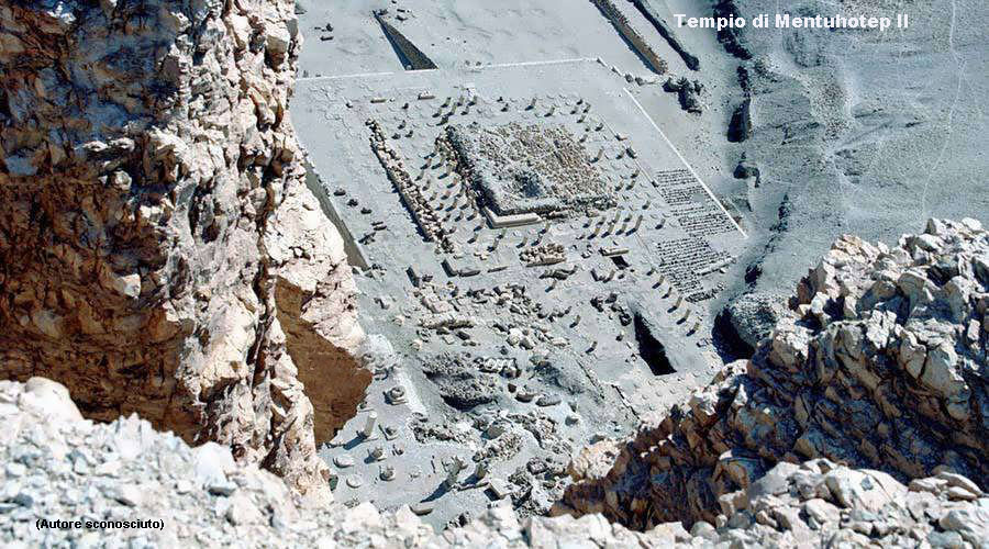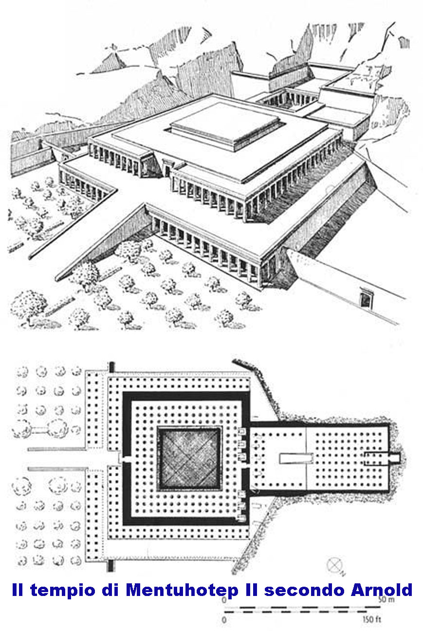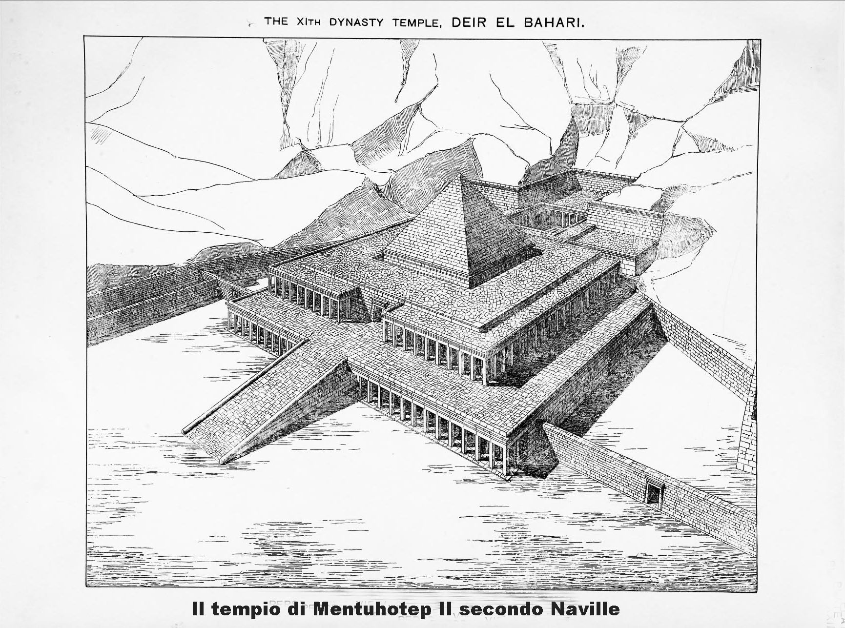 Ora andiamo a visitare l’intero complesso cercando di capire come è composto. Secondo l’egittologo Herbert Winlok il complesso a terrazze venne eretto in tre fasi, mentre secondo Arnold in quattro: a) l tempio a valle, di cui oggi non rimane nulla poiché si trova sepolto sotto i campi, b) la rampa cerimoniale scoperta e costeggiata da statue del sovrano in forma osiriaca e c) il tempio vero e proprio formato da terrazze sovrapposte e da una camera funeraria sotterranea.