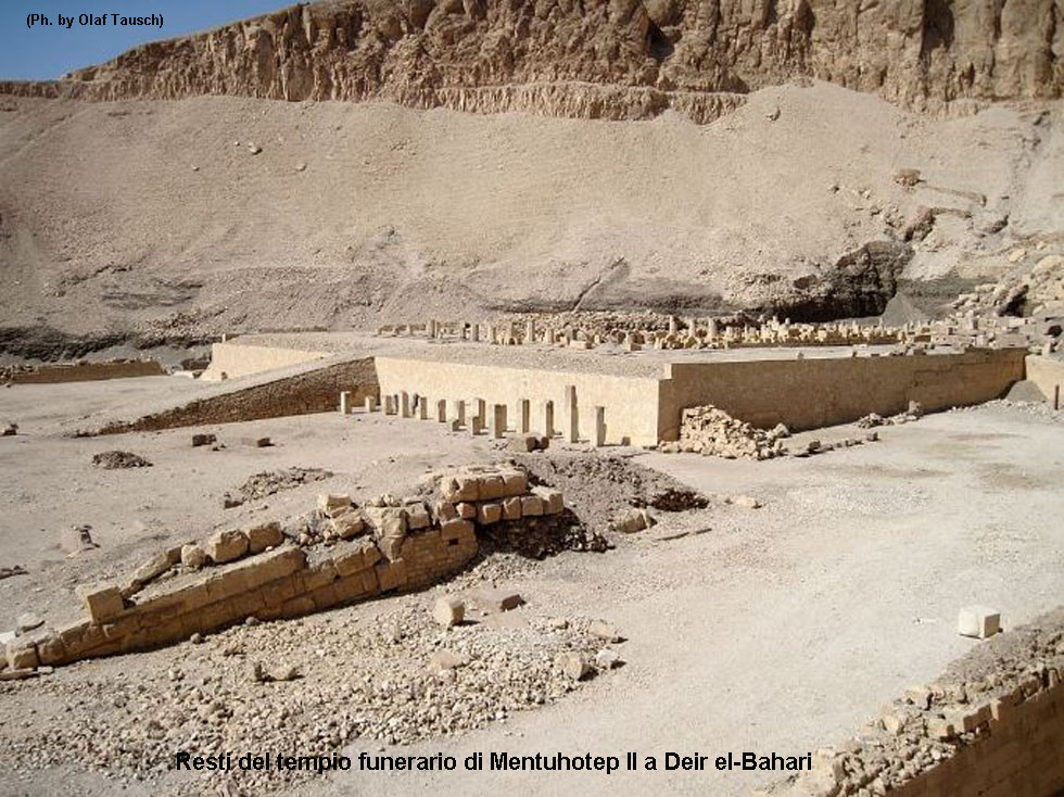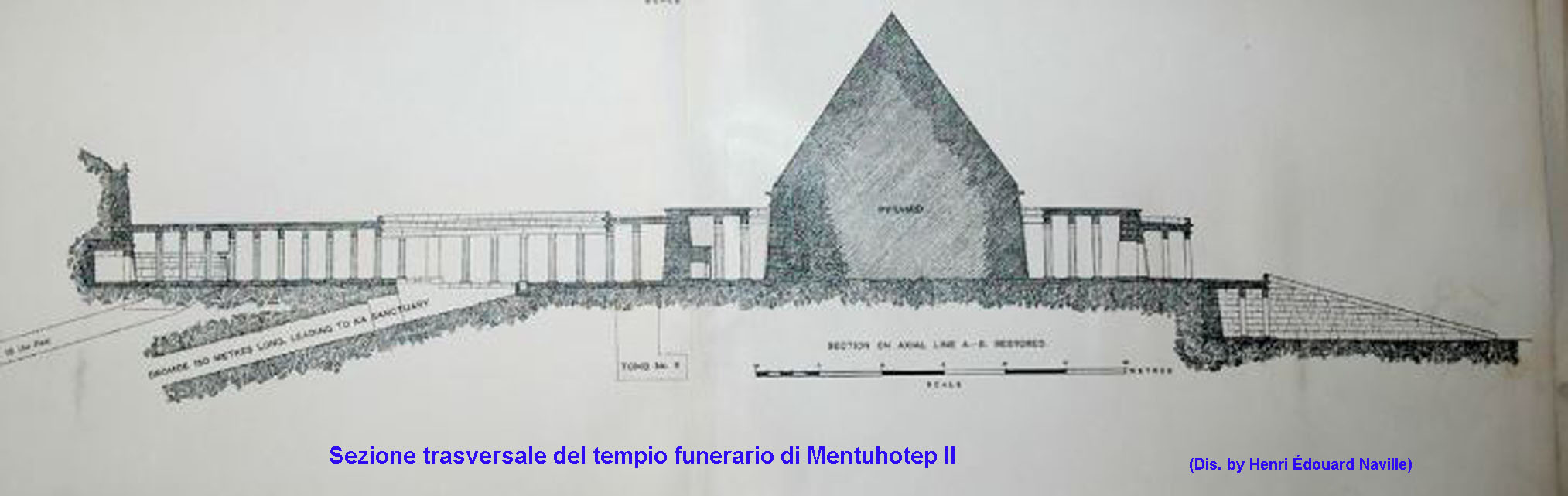 Il suo complesso sepolcrale, da lui chiamato “I luoghi (di culto) di Mentuhotep risplendono”, per il periodo rappresenta un’innovazione in quanto consiste in uno dei primi esempi di architettura del Medio Regno a Tebe ovest di fronte al Grande tempio di Amon di Deir el-Bahari. La falesia tebana ne costituisce lo sfondo del complesso così come per altri templi tra i quali spicca quello della regina Hatshepsut. Ho detto che costituisce un’innovazione in quanto il tempio di Mentuhotep II è il primo caso di transizione dal classico complesso piramidale dell’Antico Regno a quello che sarà il “Tempio di Milioni di Anni” con tomba ipogea del Nuovo Regno.