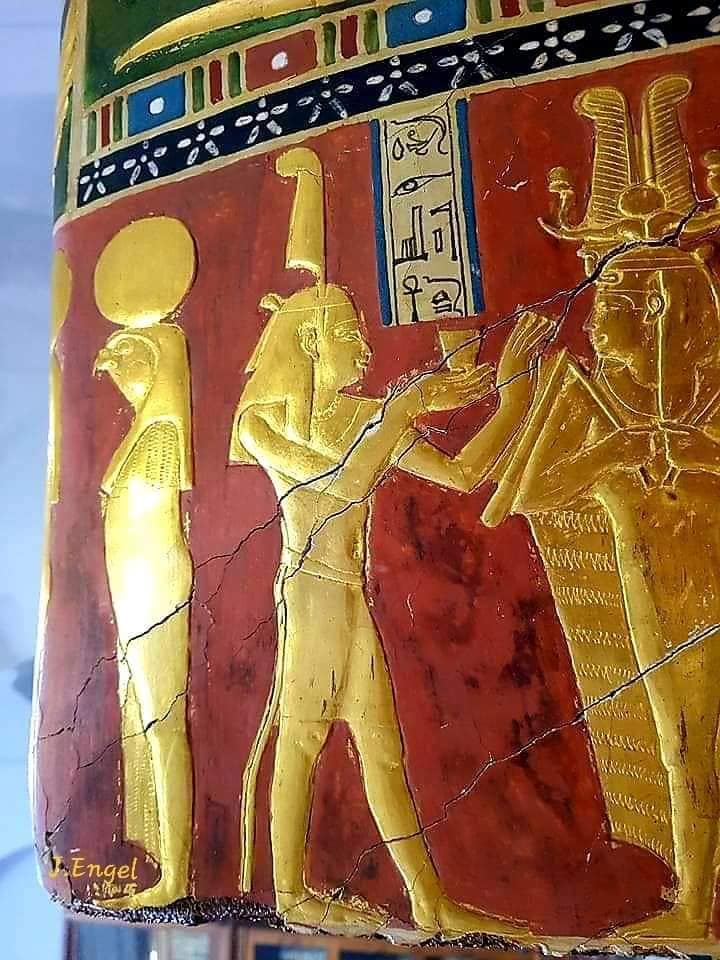 A mummy mask decorated with images of amulets to protect and deities to help and protect the deceased. Some beautiful details, in a pendant the four sons of Horus and on both sides a hawk headed god, the one on the left is holding the white-crown of Egypt. While the one on the right is holding the red crown of Egypt in its hands.