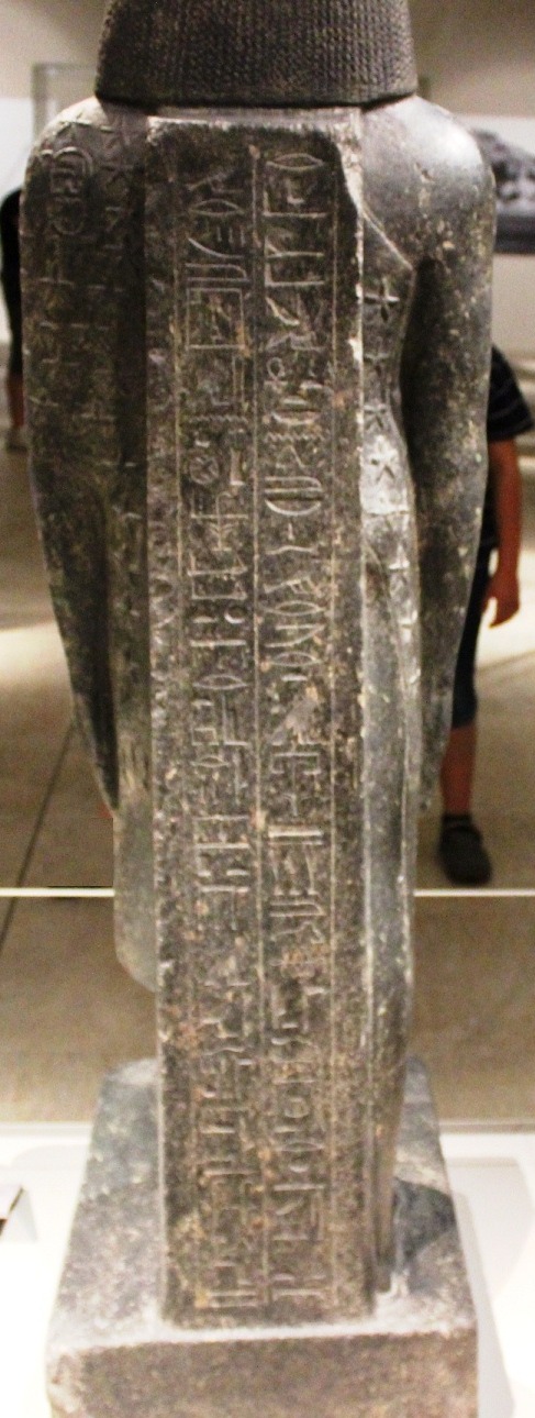 I testi incisi sulla statua sono composti da una colonna verticale sul davanti situata sul gonnellino sotto alla testa del felino.