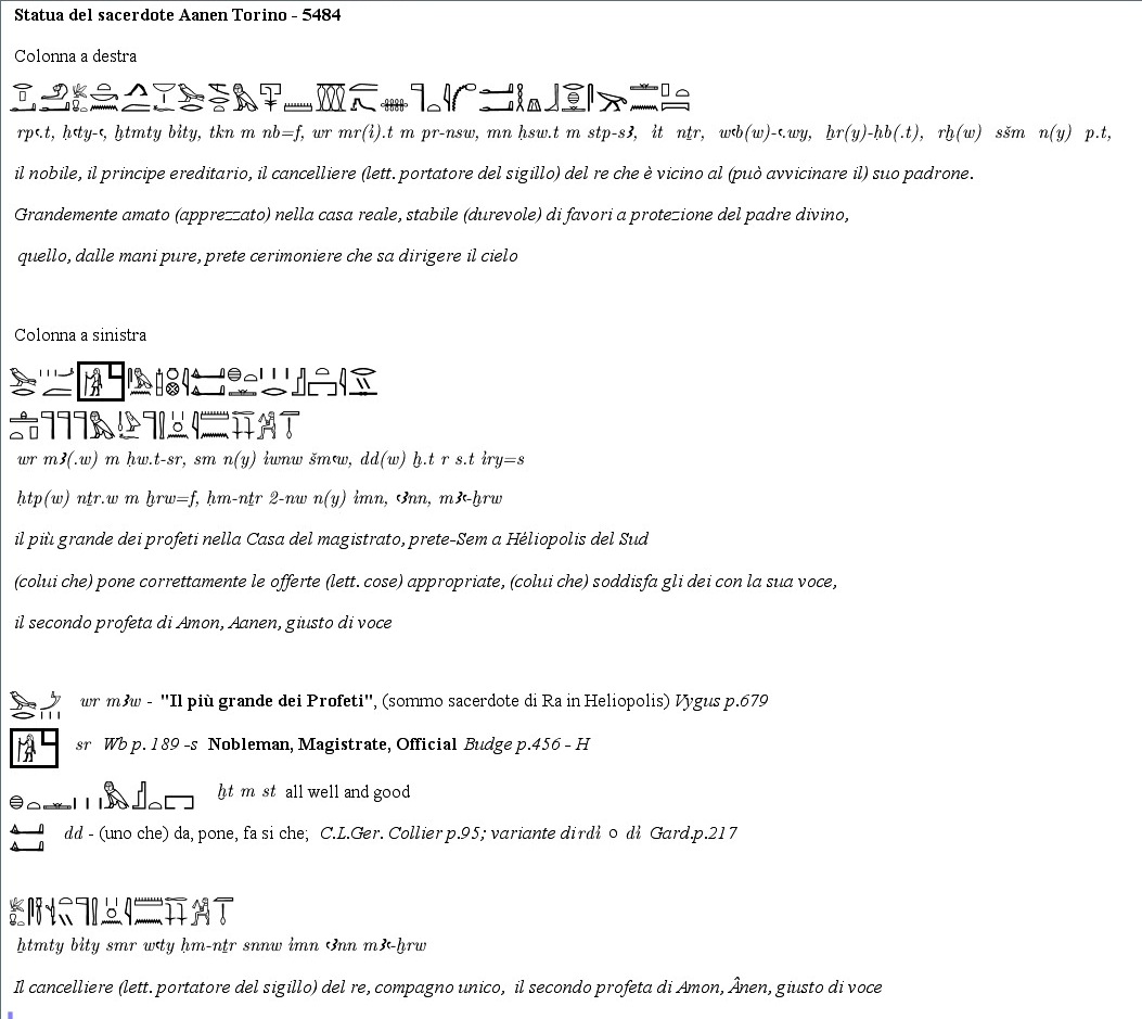 L’iscrizione sulla statua evoca esplicitamente gesti propri del ruolo sacerdotale, in particolare la deposizione delle offerte agli dei e la recitazione di preghiere: Aanen è ” uno che mette le cose a posto”, cioè le offerte nel luogo designato, e ” propizia gli dei con la voce”.