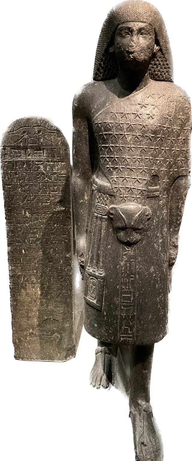 Questa scultura in pietra dura nera (granodiorite), dal viso pur rovinato, di dimensioni leggermente inferiori, com’è consuetudine per le statue di privati mentre i formati maggiori erano riservati a sovrani e dei, ci mostra un dignitario, Aanen secondo sacerdote di Amon, vestito con parrucca, lunga gonna e la pelle di leopardo che contraddistingue certi sacerdoti.