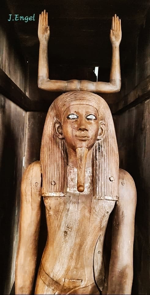 It seems that the Ka statue once held a scepter in its right hand and a staff in its left hand. The statue of the king was fixed to a wooden panel that could be taken out of the naos