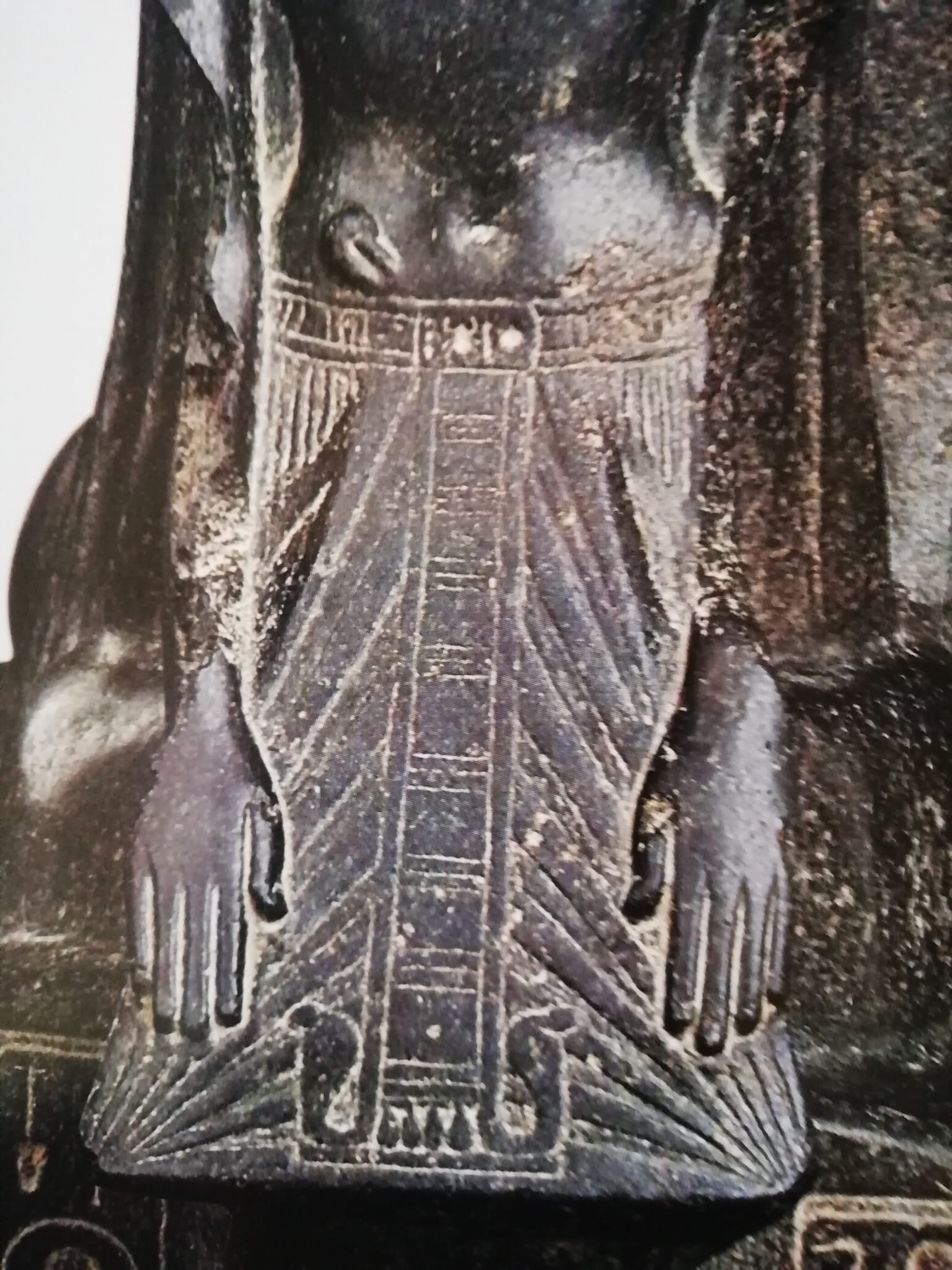 La banda del gonnellino è decorata da una fascia che parte dalla cintura e termina in basso con due urei.
