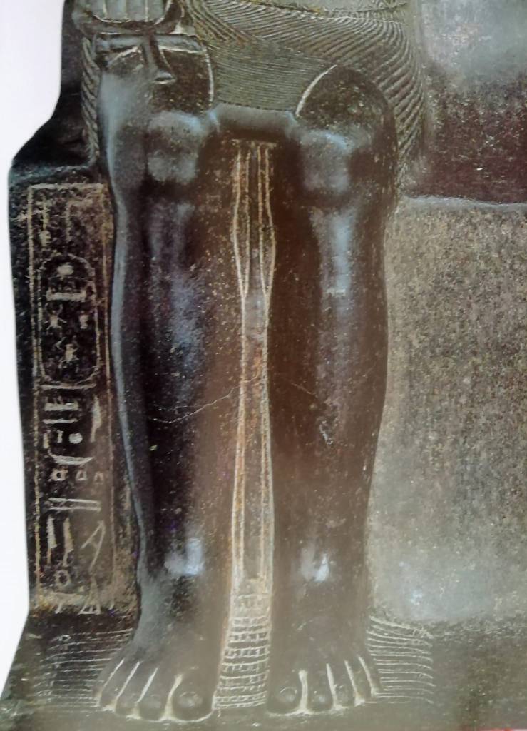 Thutmosi indossa il gonnellino shendyt con la cintura decorata da disegni romboidali concentrici e chiusa da una fibbia su cui è inciso il suo nome.