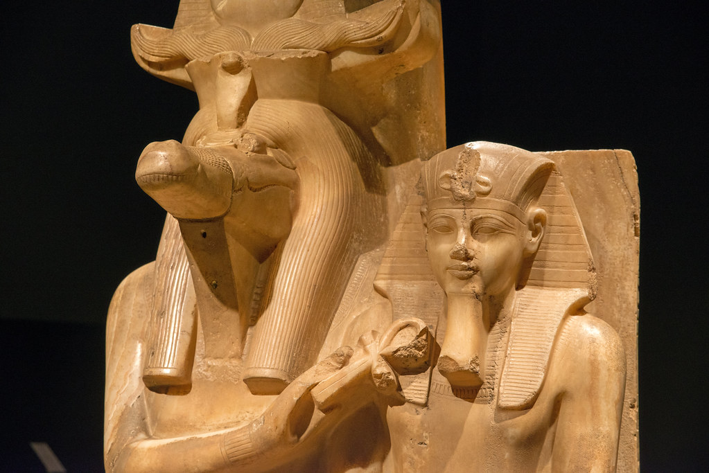 Questo gruppo statuario proviene da un tempio si Sobek a sud di Tebe, presso il quale si trovavano anche coccodrilli sacri.