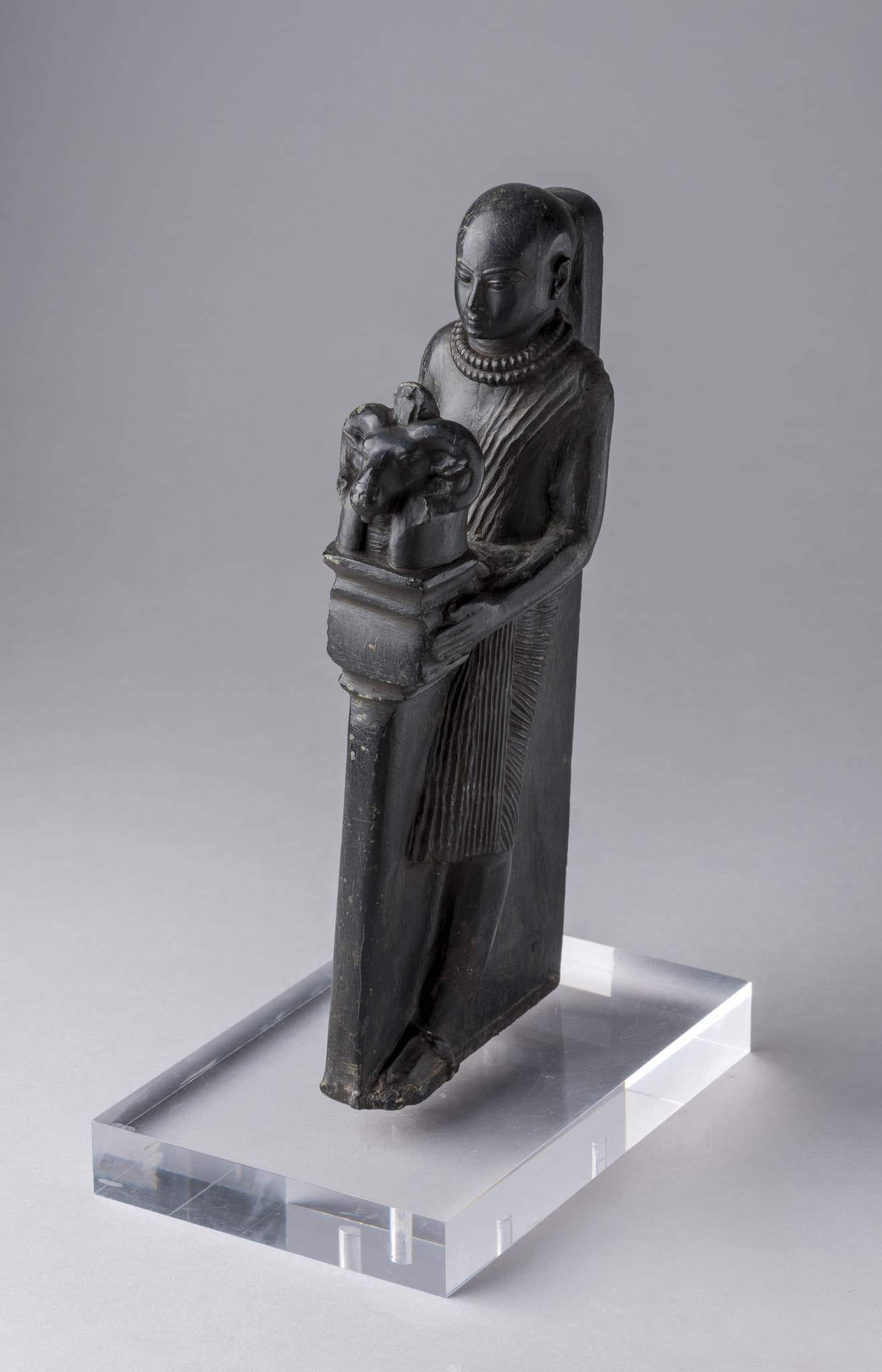 Questa statuetta è in steatite, una pietra relativamente tenera e facile da lavorare, è alta 20 cm, ma ha una fattura molto raffinata. È priva di di epigrafe, ma la testa completamente rasata potrebbe indicare che il personaggio ritratto sia un sacerdote. La rasatura dei capelli era una forma di purificazione e pulizia praticata da chi era in contatto con le immagini divine. Gli occhi allungati e contornati suggeriscono una datazione al regno di Amenhotep III.