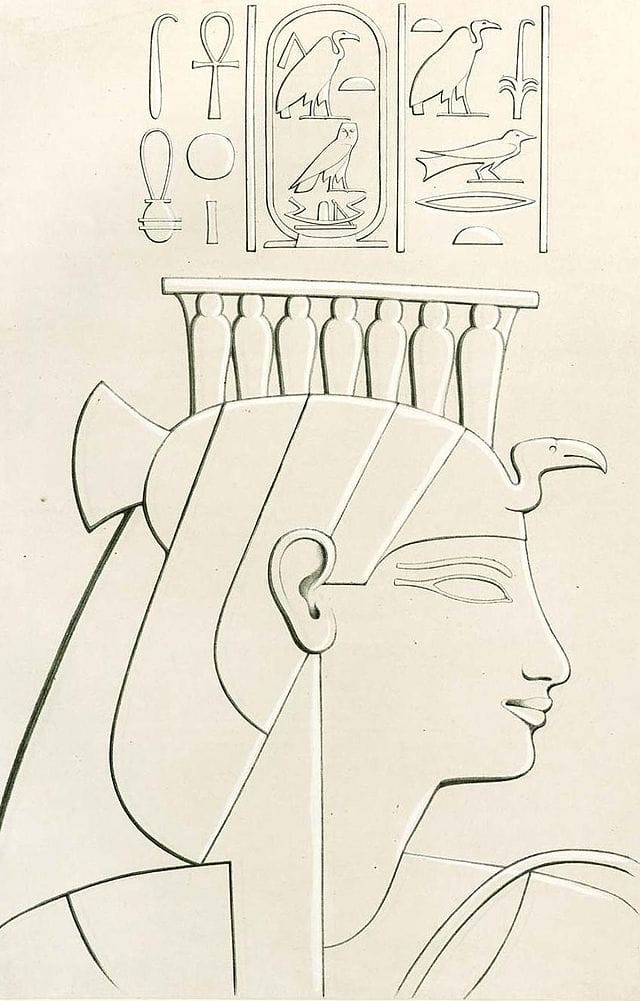 Mutemwia stringe una croce ad anello, il simbolo geroglifico della vita (ankh). Un avvoltoio spiega le sue ali intorno alla regina e al trono. Questa è un’immagine di Mut, consorte del dio supremo Amon-Ra.