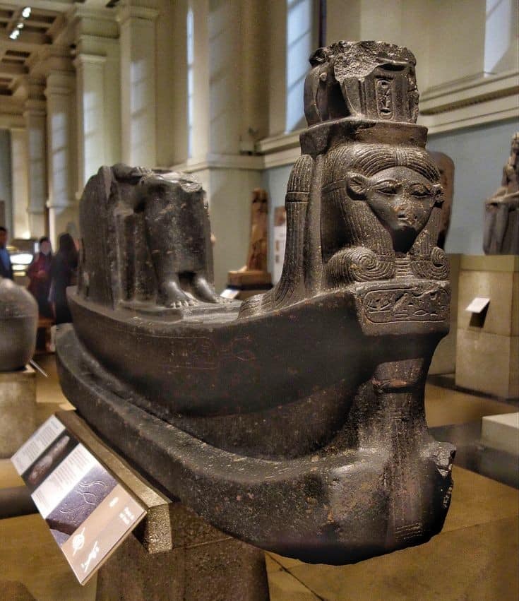 Mutemwia infatti significa “Mut è nella barca sacra”, quindi la scultura è anche un rebus che visualizza il nome della regina. La doppia faccia sulla prua rappresenta Hathor, la dea più amata e universale dell’Egitto, i cui compiti includevano feste e musica. I cartigli sulla sua corona nominano il figlio di Mutemwia, re Amenhotep III.