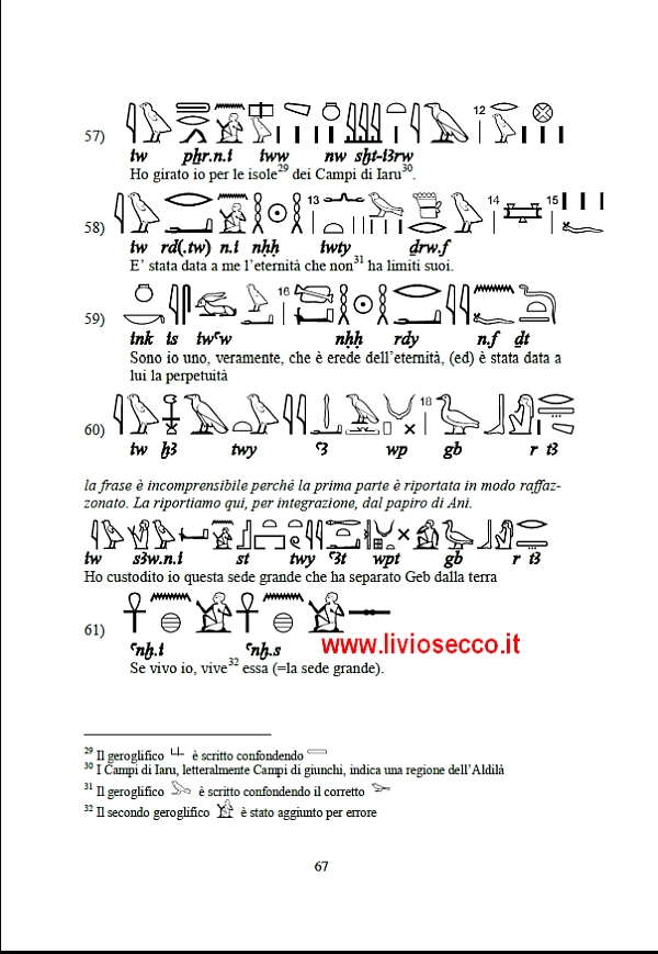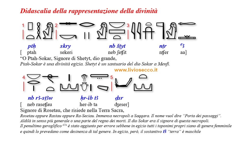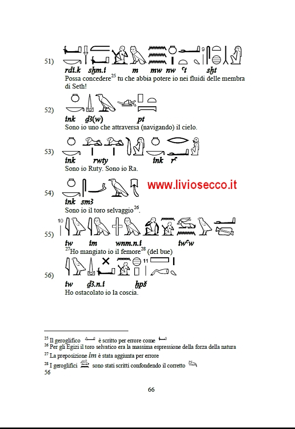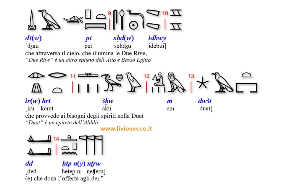 Di seguito il commento filologico della spina centrale; come di consueto ho aggiunto la fonetica in base al codice IPA per permettere di leggere il geroglifico a chi non lo ha (ancora) studiato.