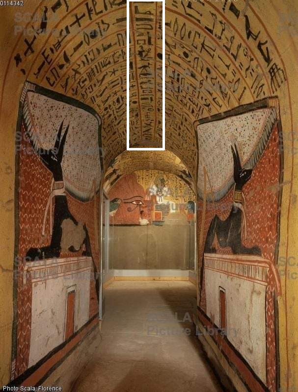 Il tunnel di accesso è decorato con una spina centrale e con due superfici laterali che coprono le due pareti laterali dove è anche raffigurato per due volte il dio Anubi.