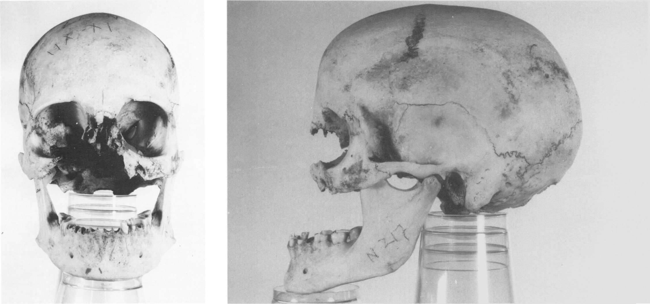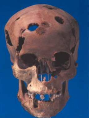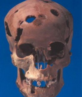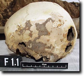 Impressionante osteolisi del cranio di una donna, interpretata come conseguenza di metastasi ossee. Nuovo Regno, necropoli occidentale di Tebe.