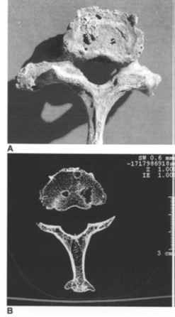 Osteolisi (perdita di tessuto osseo) multipla su una vertebra con relativa TC, indizio di metastasi ossee di un sarcoma dei tessuti molli. Nuovo Regno, necropoli occidentale di Tebe.