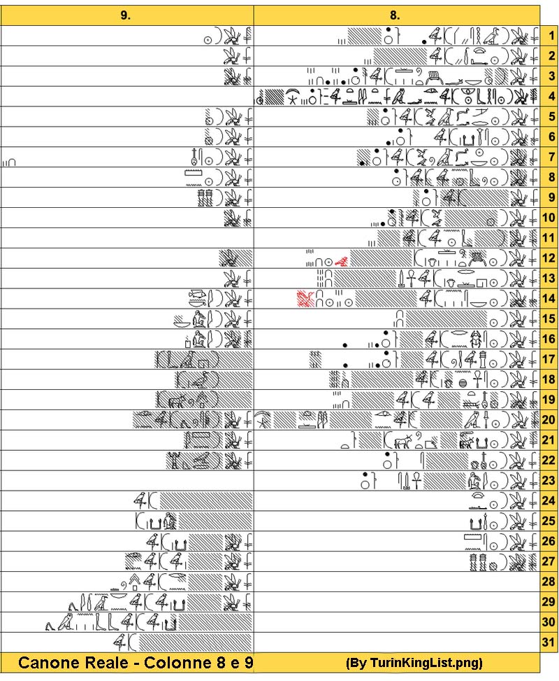 L’unica altra fonte sono, come già detto, le colonne 8, 9 e 10 del Canone Reale di Torino. Occorre precisare che il termine “dinastia”, in questo periodo turbolento della storia egizia, non ha nulla a che vedere con la successione nell’ambito di una famiglia ma è puramente simbolico in quanto identifica sovrani più disparati che si succedono al trono senza alcun grado di parentela.