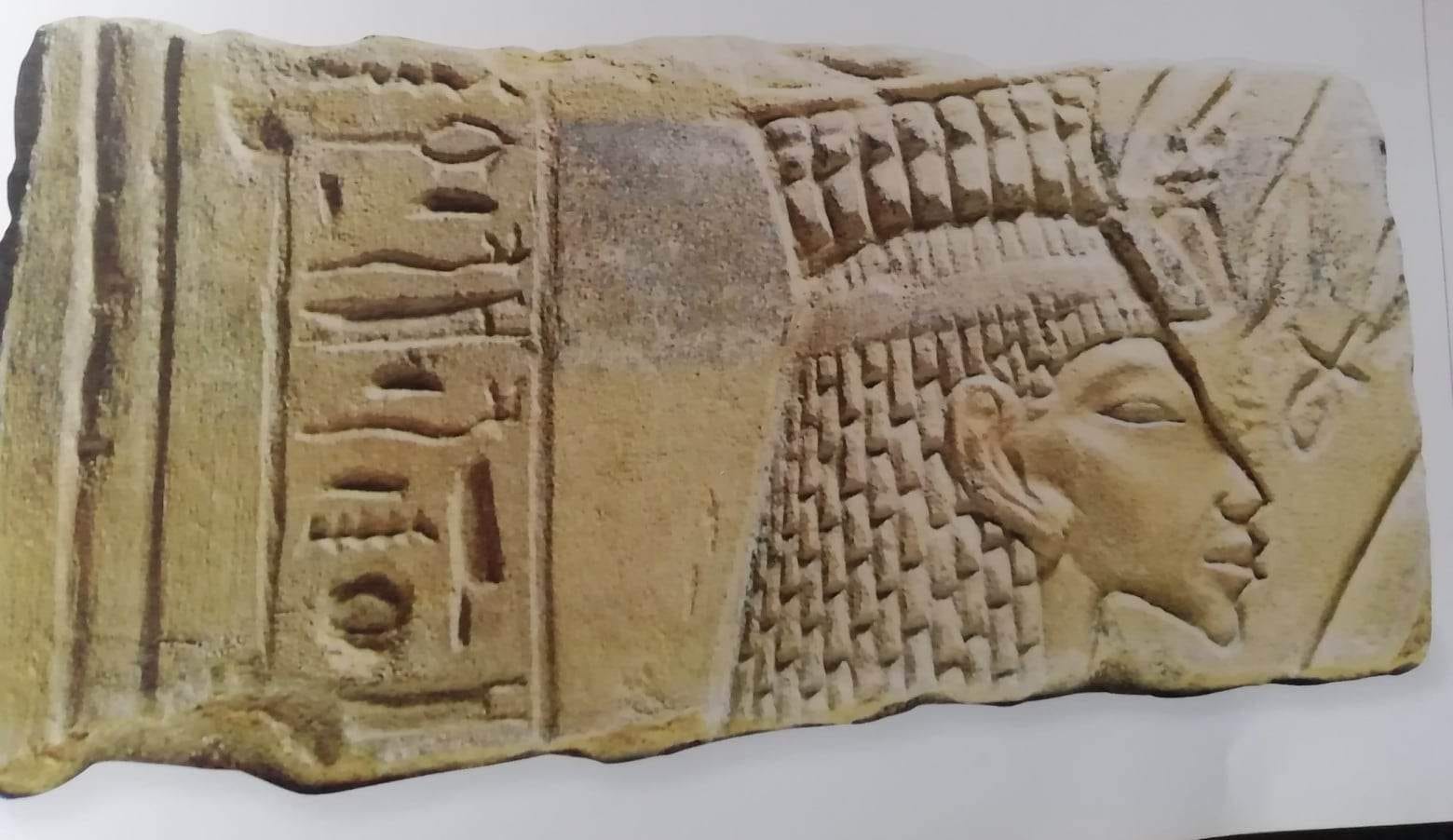 Il profilo della regina appare eseguito nello stile dei primi anni di Akhenaton, con i tratti esageratamente marcati.
