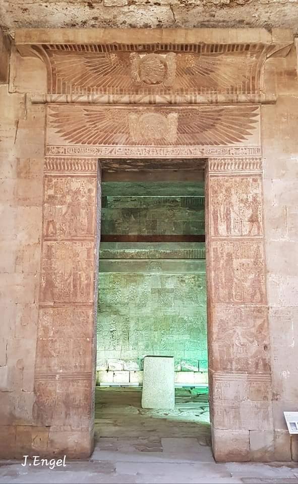 The temple was built of sandstone, and has two doors, of which the main one is crowned with an ornament topped by a winged sun disk.