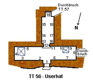 L’ingresso della struttura è posto nella parete rocciosa dell’estremità meridionale del cortile ed è incorniciato da piedritti e da un’architrave scolpiti nella pietra naturale; sui primi sono incise formule di offerta ad Amon-Re, Re-Horakhty e Osiride, Anubi e Hathor mentre l’architrave raffigura Userhat e sua moglie davanti ad Osiride.