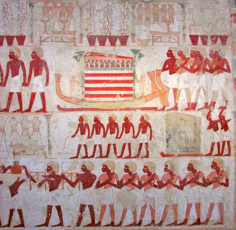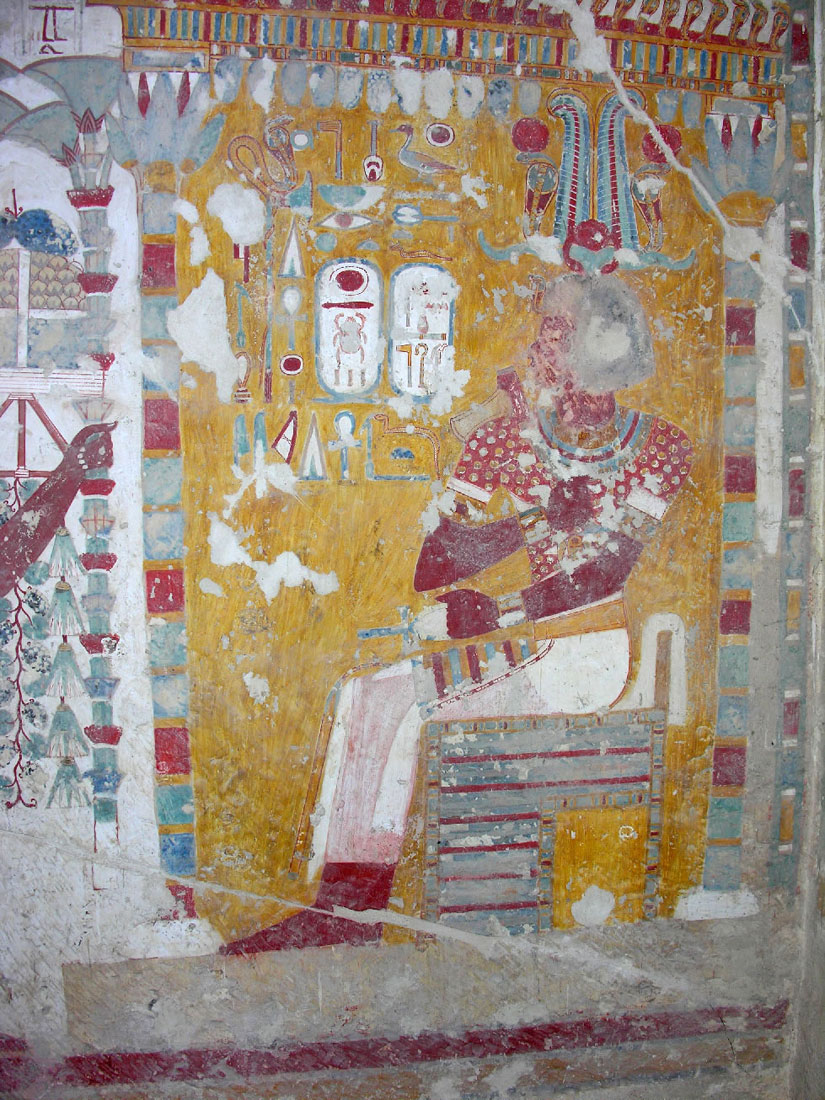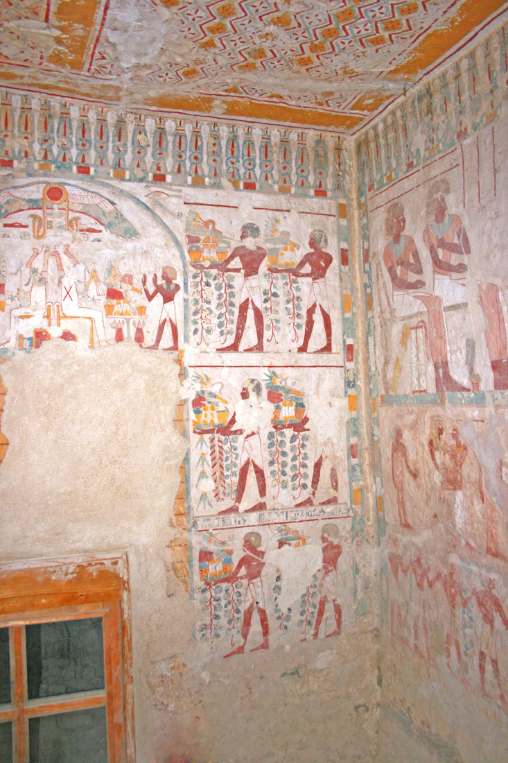La parete ovest (parete lunga a destra) è divisa in vari registri: quelli superiori illustrano la processione funebre, quello inferiore il pellegrinaggio fluviale ad Abydos.
