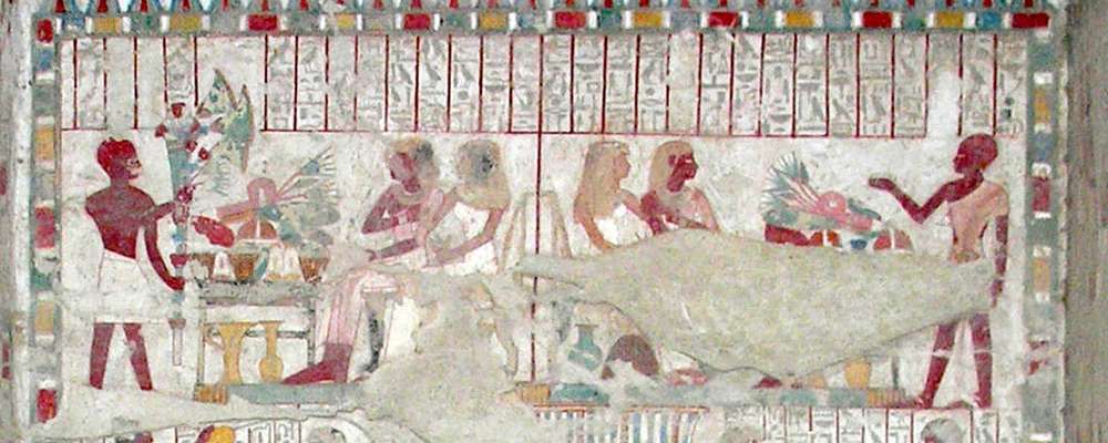 Gli ospiti sono rappresentati sotto di loro: tre donne, sedute a terra su di una stuoia, tendono le mani verso la mensa delle offerte; un’ancella ha una boccetta di olio profumato per ungere i commensali.